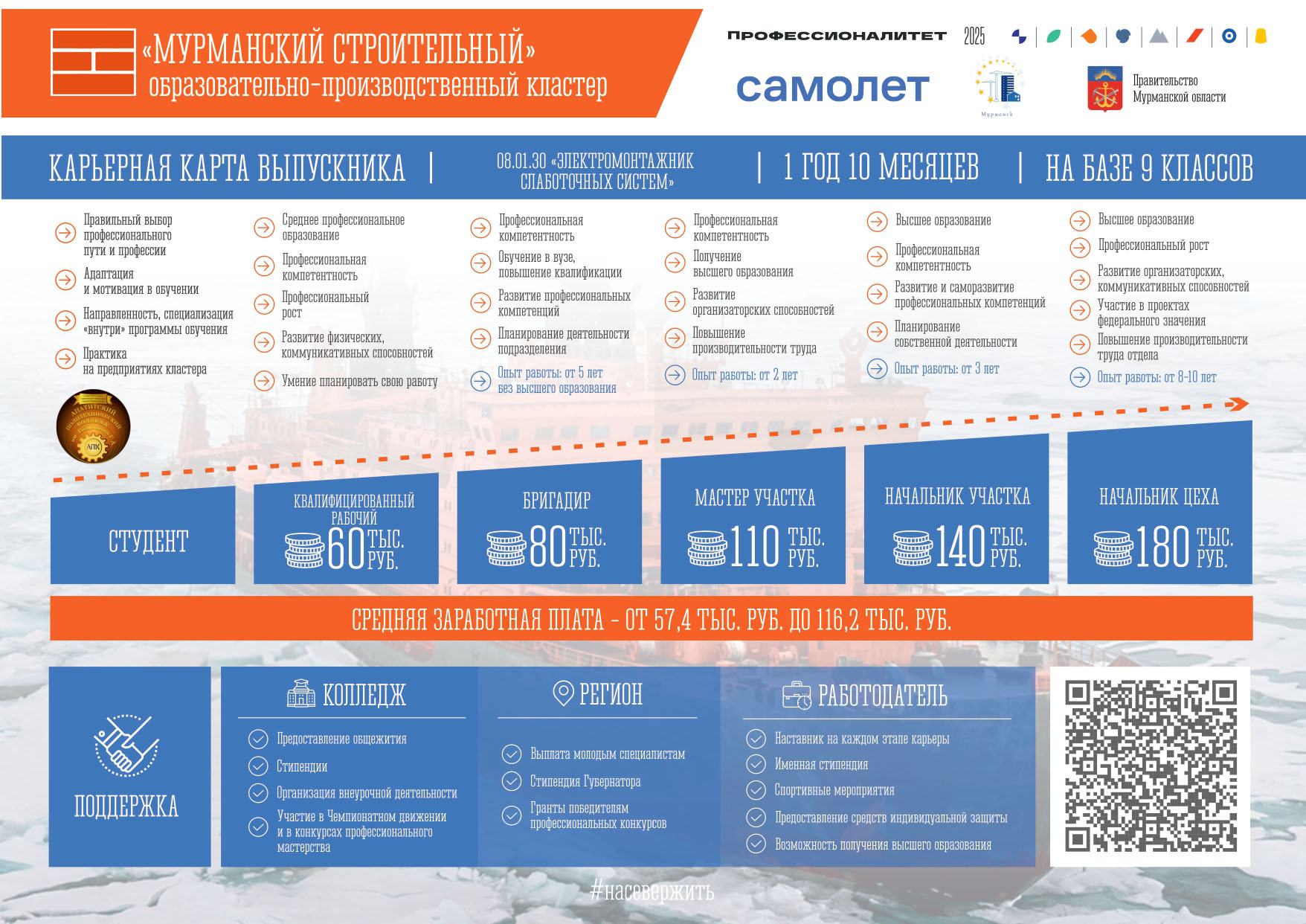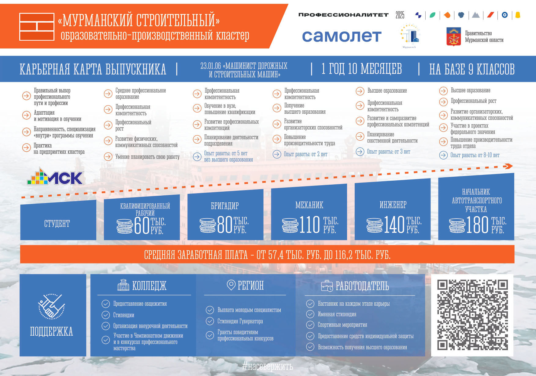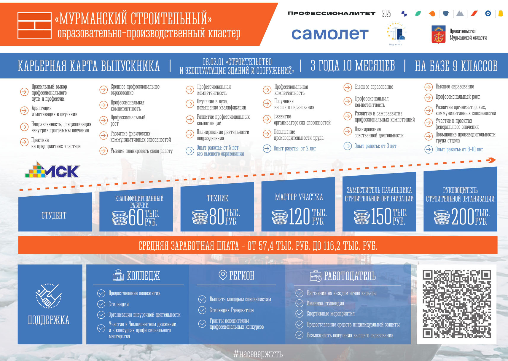 Карьерные карты выпускников, обучающихся по программе федерального проекта «Профессионалитет» образовательно-производственного кластера «Мурманский строительный» по следующим специальностям: