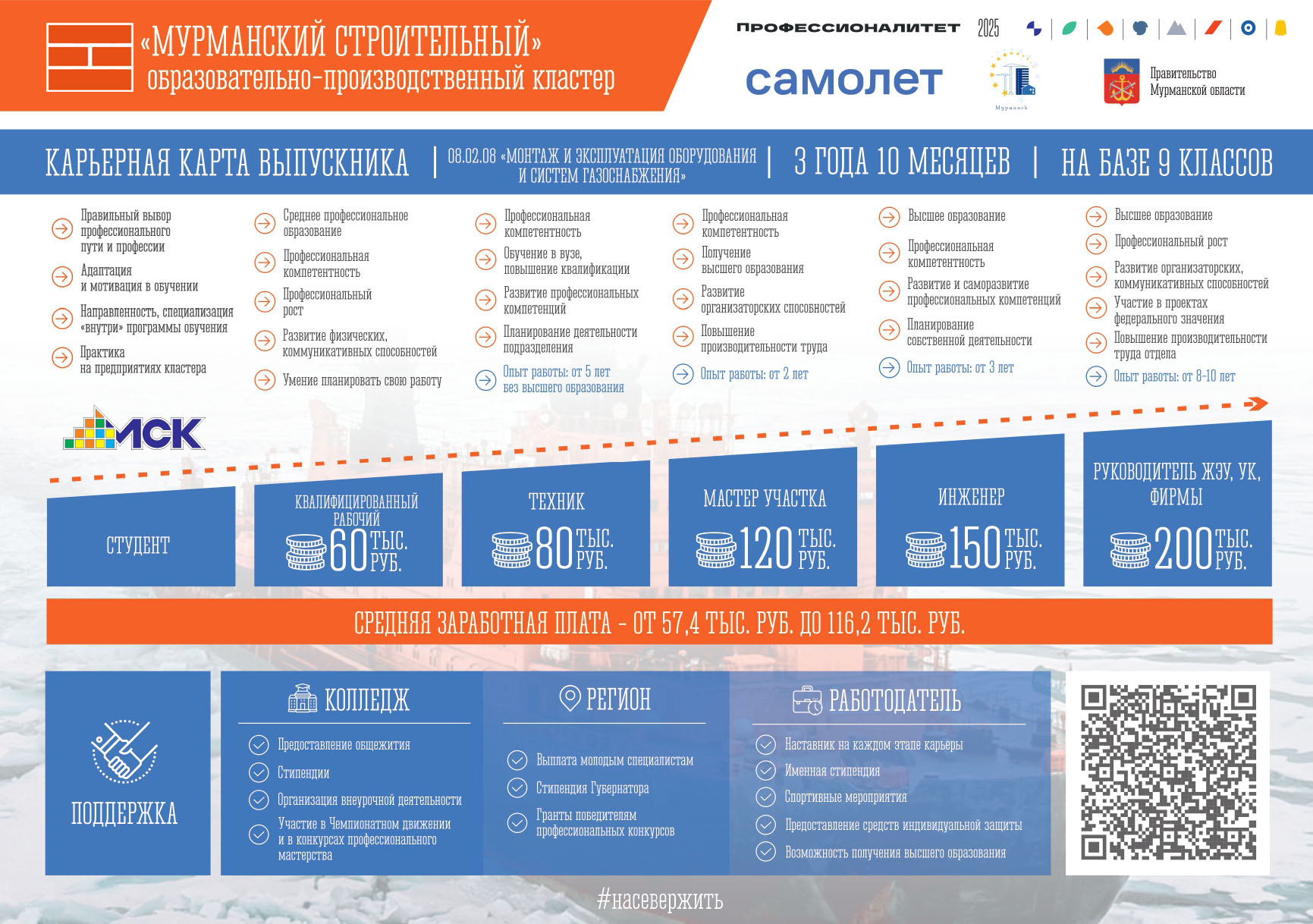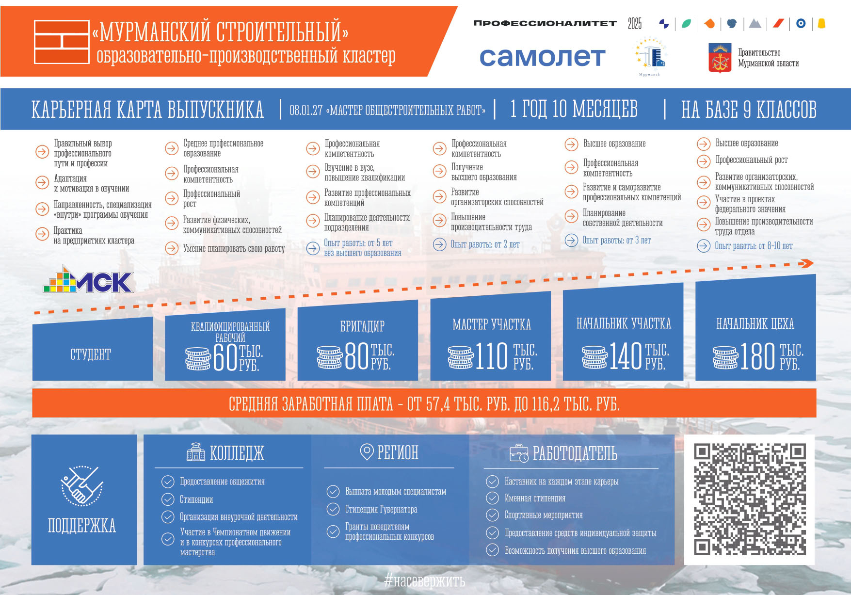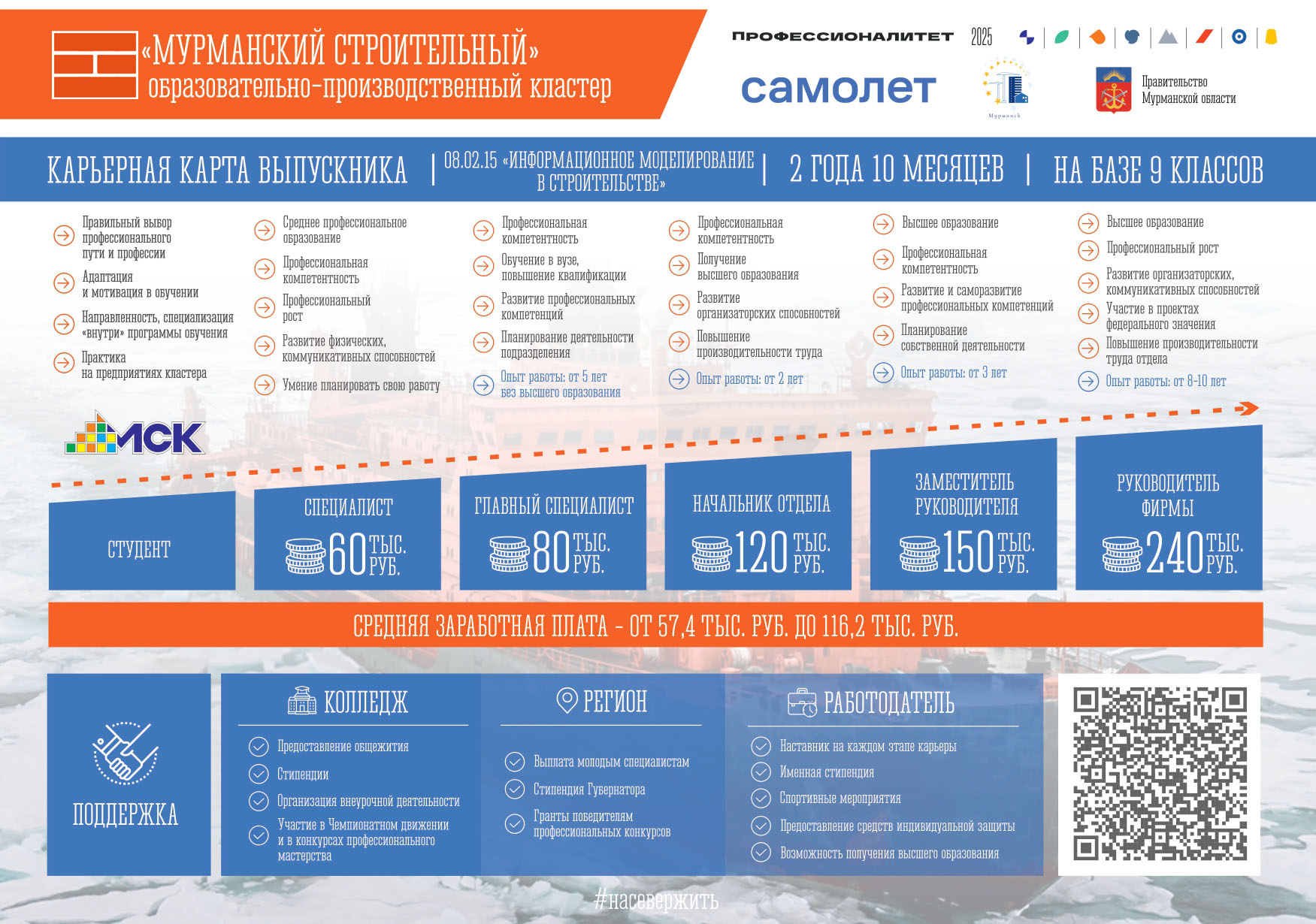Карьерные карты выпускников, обучающихся по программе федерального проекта «Профессионалитет» образовательно-производственного кластера «Мурманский строительный» по следующим специальностям: