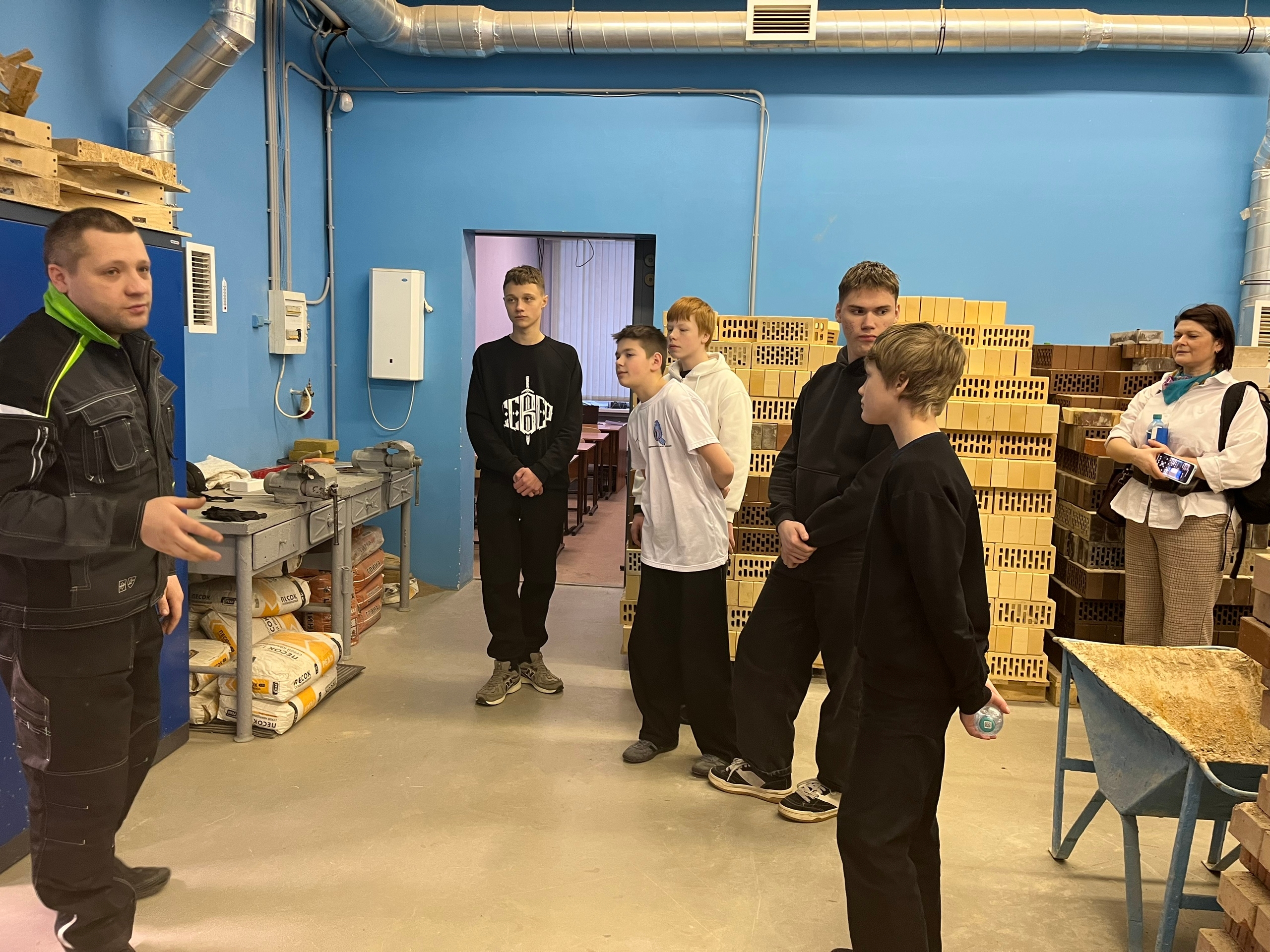 Мастерская “Каменная кладка” – мастер производственного обучения Зяблов А.Н. рассказал о практических навыках по производству каменной кладки, устройству проёмов зданий, армированию конструкций в соответствии с заданным проектом.